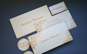 Пригласительный А6 бумага Galaxy Metallic, печать с одной стороны, 20 шт. – 40,00 руб. Калька с печатью, А6 20 шт. – 27,00 руб., скрепление на люверс — 0,10 руб./шт. Конверт С6 бумага Galaxy Metallic 120 г/м, цветная печать, 20 шт. – 141,00 руб. Бирки с односторонней печатью 90*50мм или диам. 60мм, 20 шт. –20,00 руб.Карточки рассадки 50*90мм (в сложенном виде), печать с одной стороны, 20 шт. – 40,00 руб.Бонбоньерка-сердце 20 шт. – 183,00 руб.+ лента 1,00 руб./шт. |
